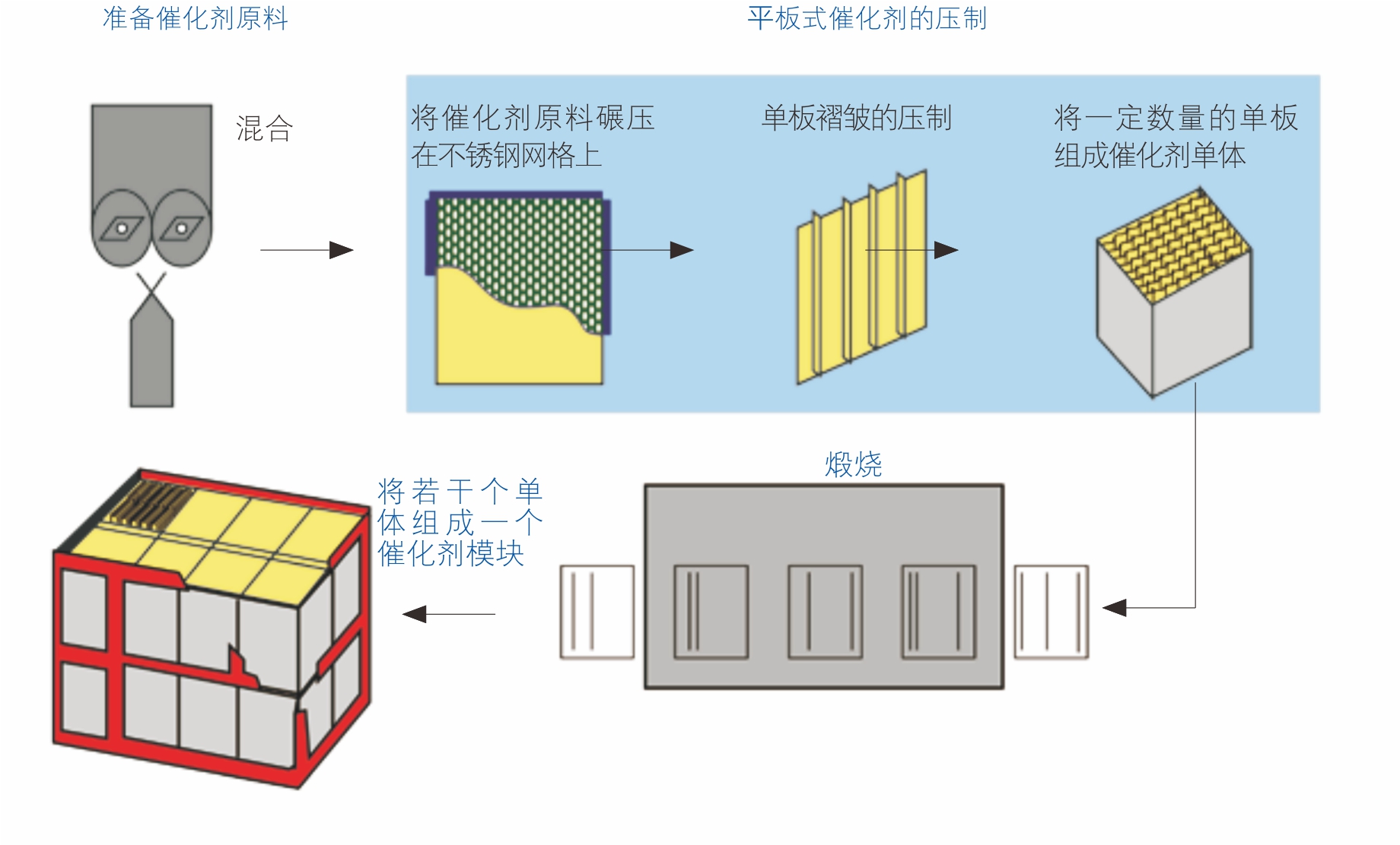 通過進(jìn)口全自動(dòng)的涂覆生產(chǎn)線,泥料被均勻地涂覆在不銹鋼擴(kuò)張網(wǎng)表面,并經(jīng)紅外干燥,壓制成型,自動(dòng)切割、機(jī)械手包裝等工序,將催化劑平板組裝成單元箱體;陳腐后通過連續(xù)式網(wǎng)帶焙燒爐煅燒活化,經(jīng)檢驗(yàn)合格,組裝成催化劑模塊,包裝發(fā)貨至項(xiàng)目現(xiàn)場(chǎng)。