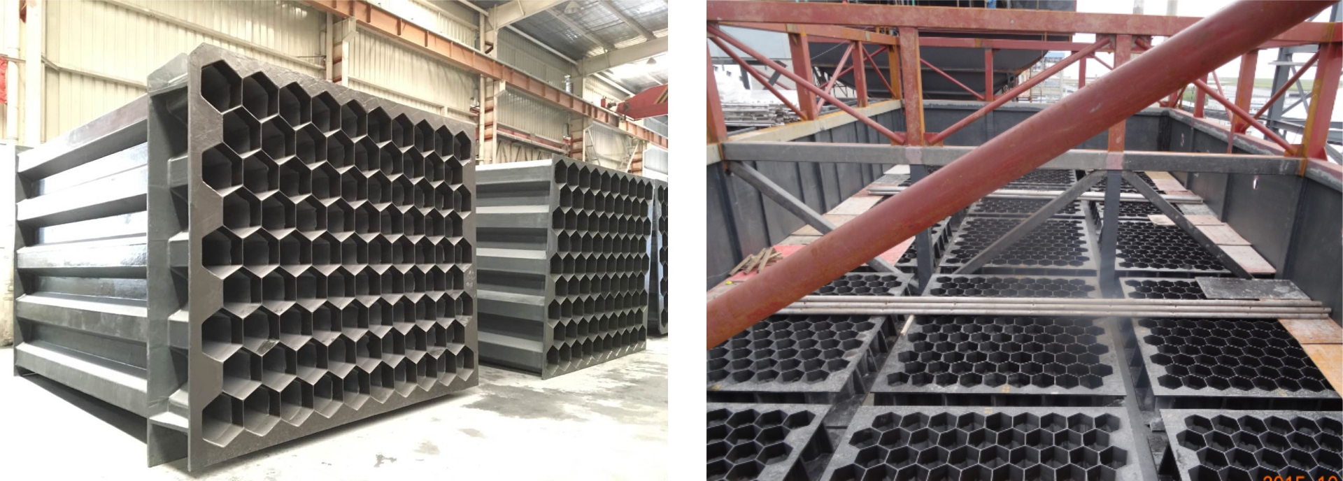 陽極模塊作為管式濕式電除塵器的收塵極,由多根玻璃鋼陽極管緊密排列成蜂窩狀,外部用法蘭框架固定,模塊表面光滑平整。