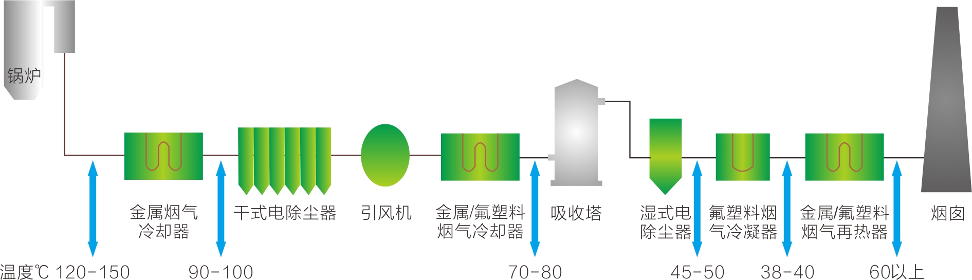 在電除塵器后吸收塔入口前布置氟塑料管煙氣冷卻器,金屬/氟塑料管煙氣再熱器布置在煙囪進(jìn)口煙道上,利用循環(huán)水與鍋爐尾部煙氣在氟塑料管煙氣冷卻器中進(jìn)行熱交換,使進(jìn)入吸收塔的煙氣溫度由120℃-150℃下降到70℃-80℃,對(duì)煙氣進(jìn)行調(diào)質(zhì),提高電除塵器煙氣處理性能,同時(shí),將循環(huán)水吸收來(lái)的熱量通過(guò)金屬/氟塑料管煙氣再熱器釋放給進(jìn)煙囪的煙氣,使煙氣溫度由45℃-50℃上升到80℃以上,同時(shí),多余的熱量可以去加熱汽機(jī)冷凝水、預(yù)熱一二次風(fēng)、加熱熱網(wǎng)水等,具有節(jié)能、節(jié)水和消白的效果。